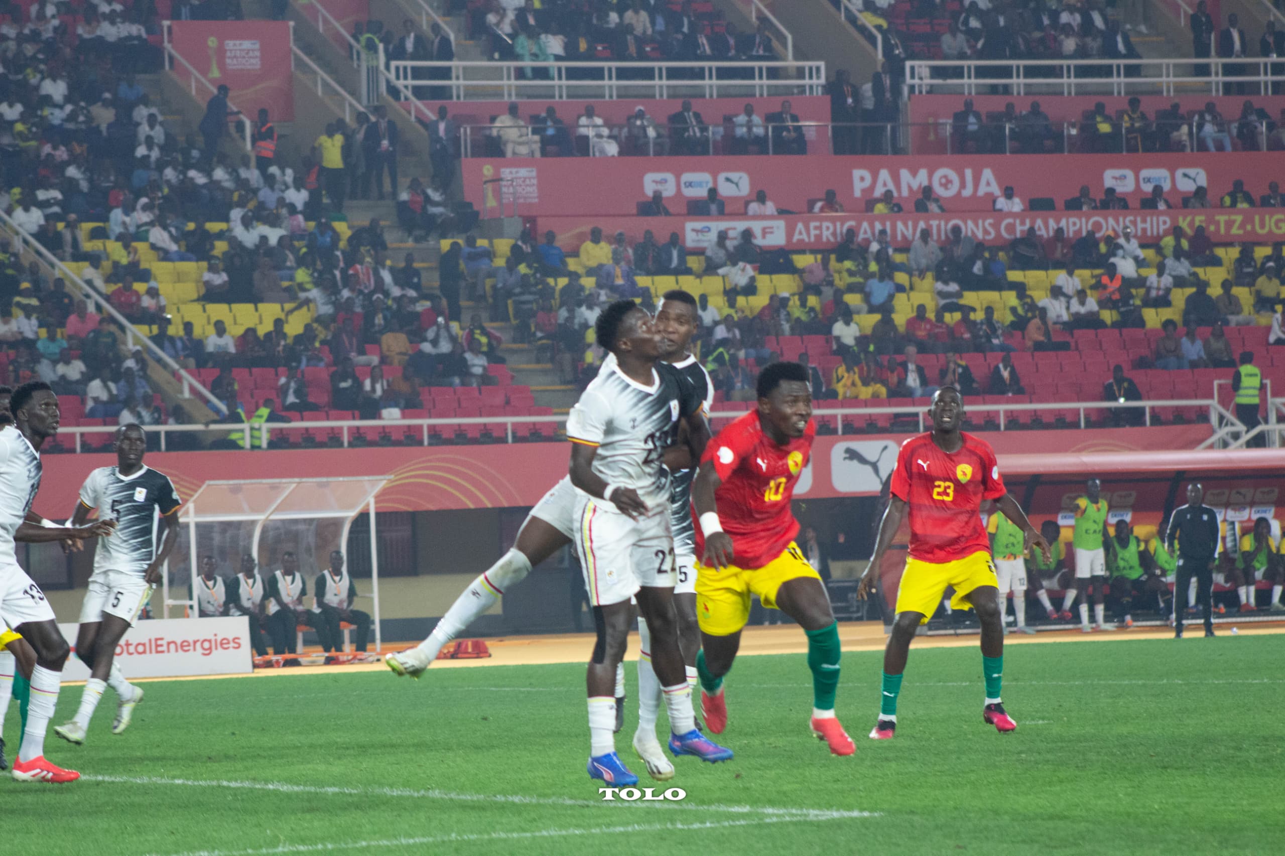 Au retour des vestiaires, galvanisés par leurs supporters, les Ougandais obtiennent un penalty à la 62e minute. Allan Okello, dossard 21, ne tremble pas et transforme l’occasion pour porter le score à 2-0.