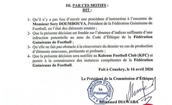 La décision de la commission éthique de la Fédération guinéenne de football suscite de nombreuses interrogations. Pourquoi aucune procédure d’instruction n’a-t-elle été ouverte à l’encontre du président de la FEGUIFOOT, Sory Doumbouya, malgré la gravité des accusations évoquées avec toutes les preuves ?