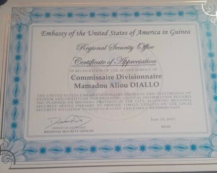 Le Colonel Mamadou Aliou Diallo, Chef du Groupement n°2 de CMIS de la Police nationale guinéenne, a reçu une distinction officielle de l’Ambassade des États-Unis d’Amérique en Guinée.